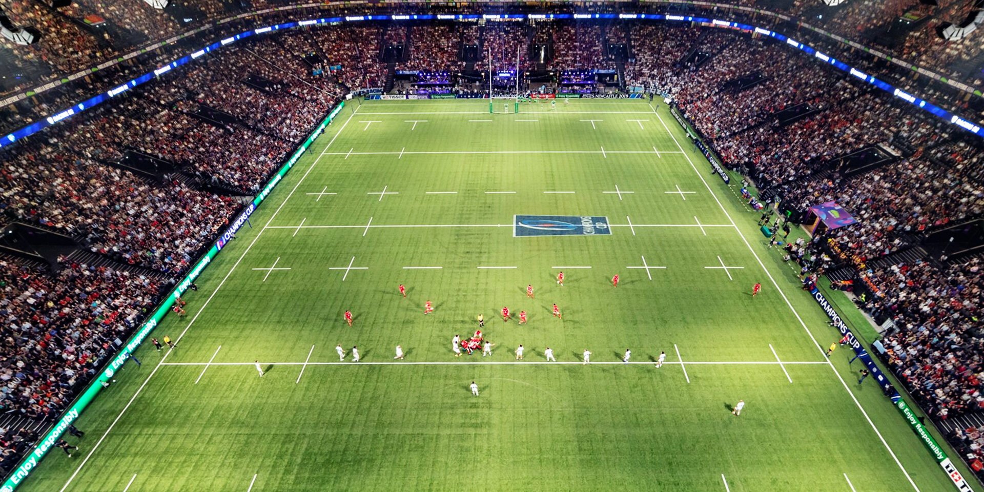 C’est en nocturne que nous avons réalisé un logo « Enjoy responsibly » [Heineken] dans l’en-but et celui de la Champions Cup en centre de terrain. Sur la vidéo ci-dessous vous verrez comment nous nous sommes intercalés entre deux évènements en suivant trois changements de configuration en quatre jours. L’Arena c’est 4000 m² d’espaces à aménager, 100 personnes mobilisées par jour sur 20 000 m², une vraie fourmilière.
