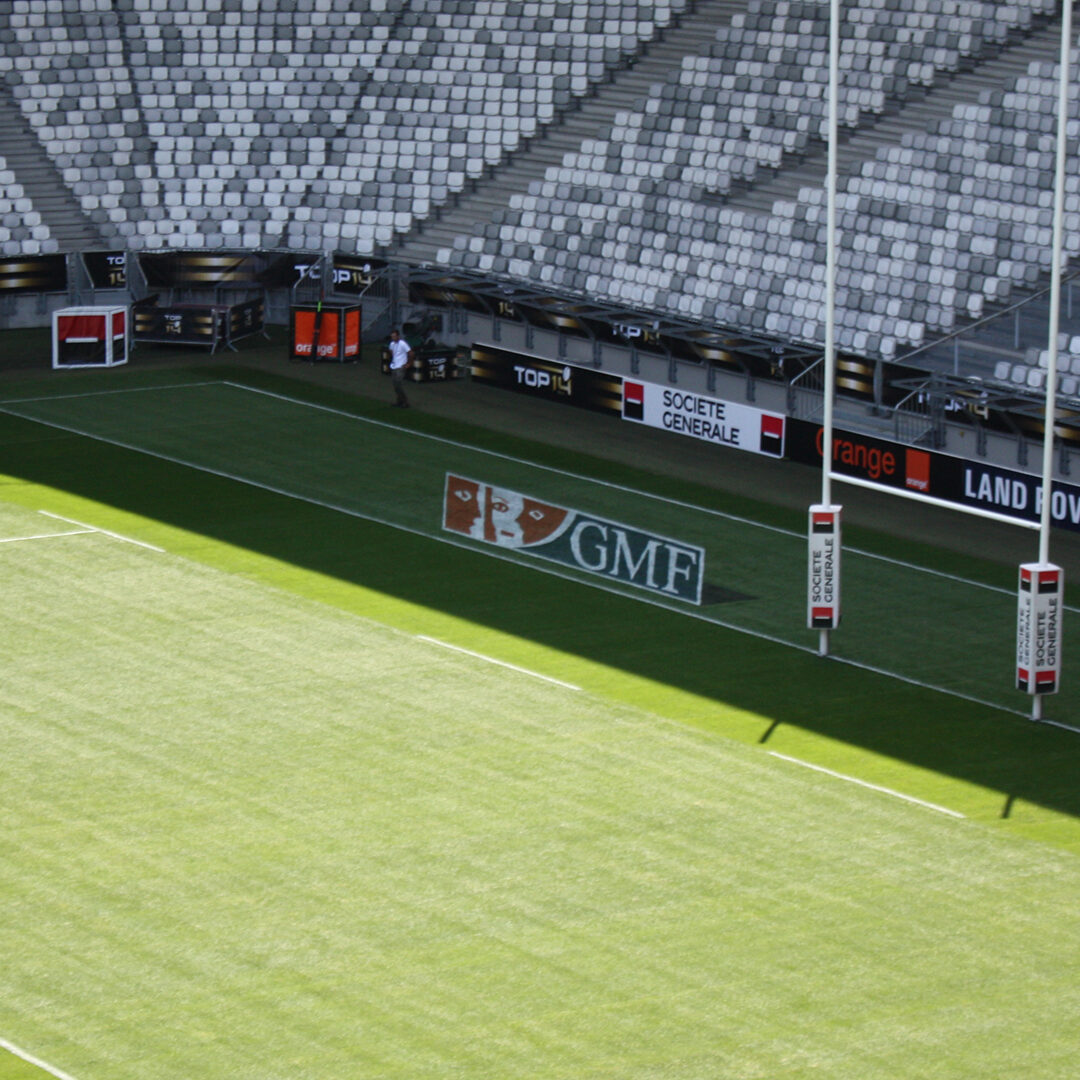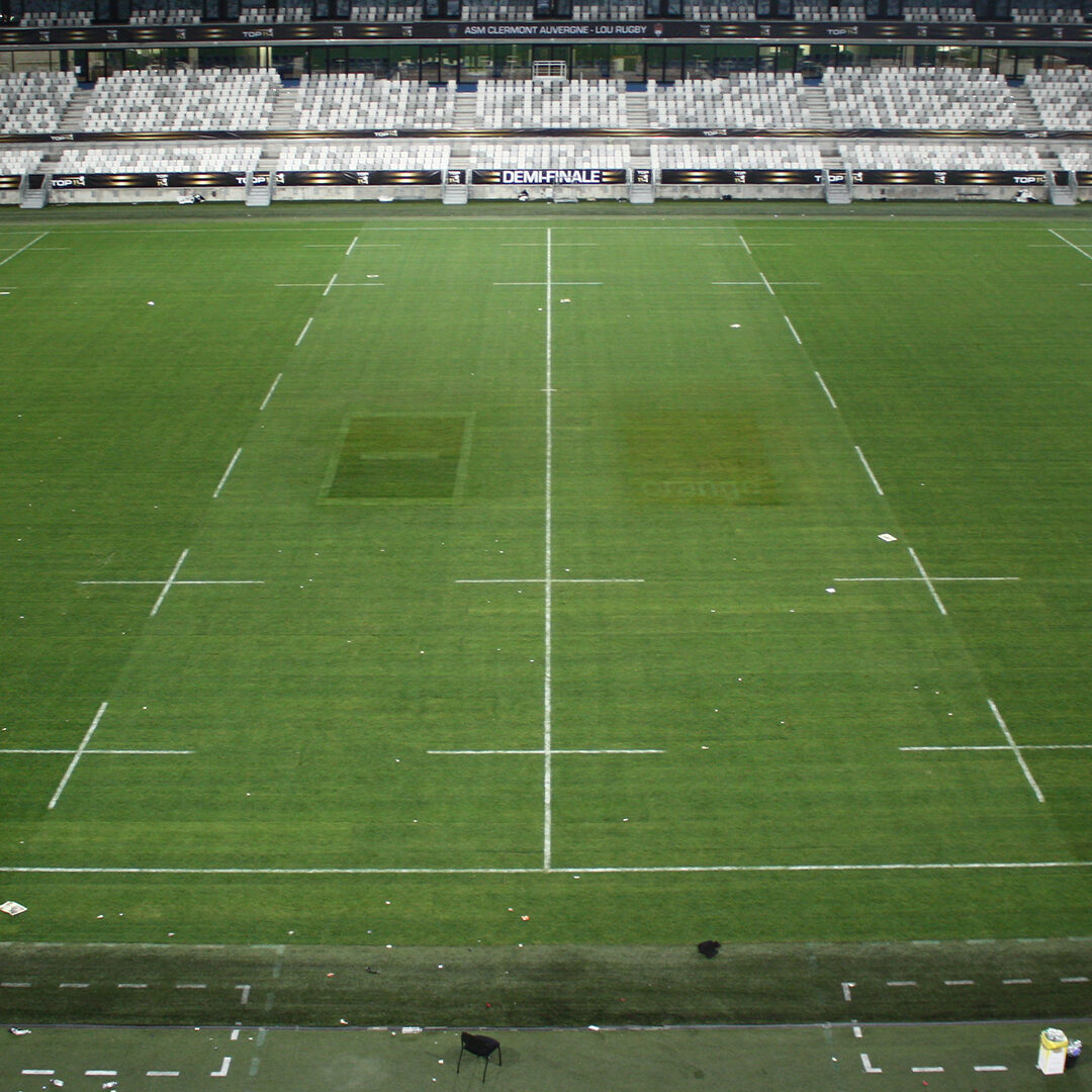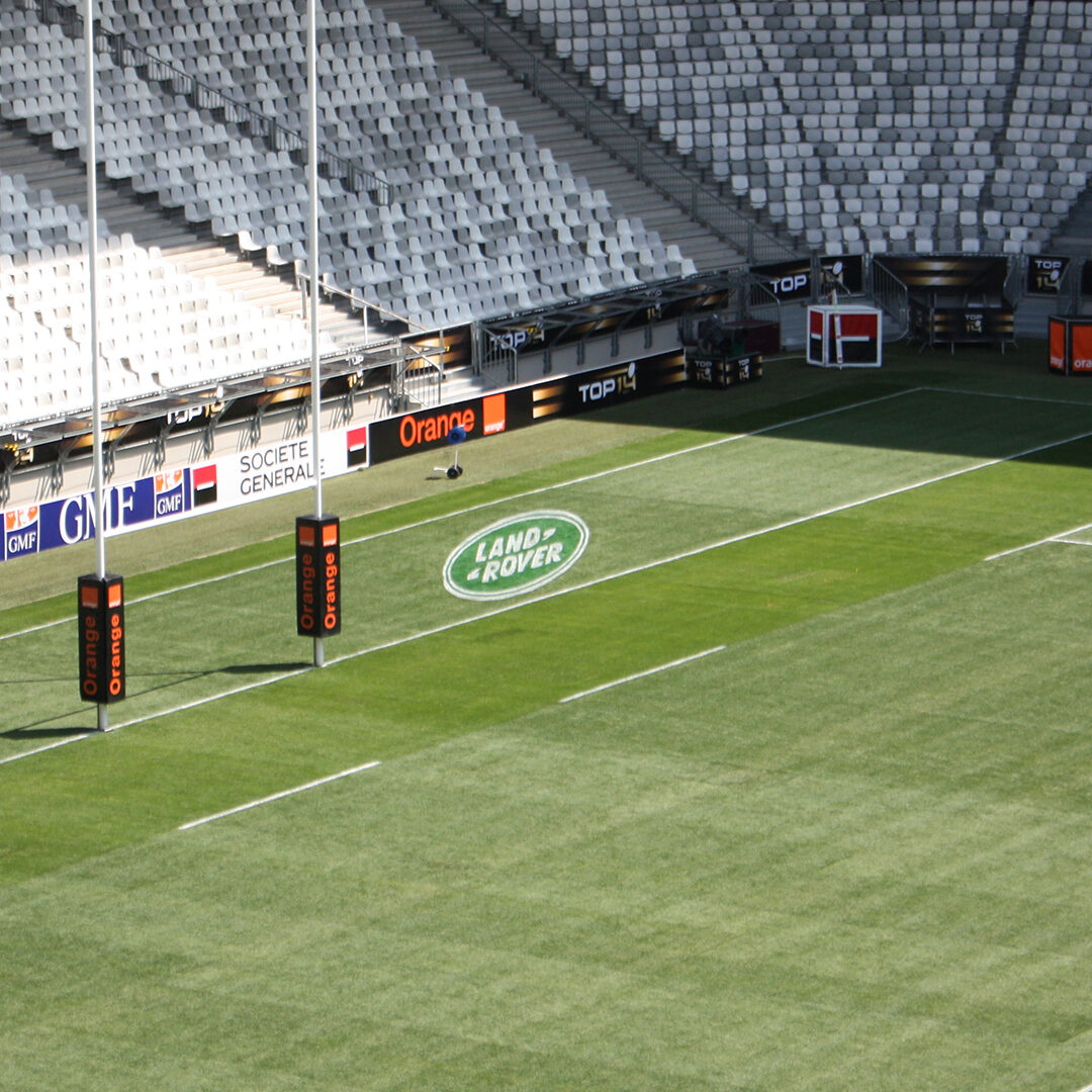Nous avons habillé le terrain avec les trois logos propres au Top14 cette saison, en ajoutant Land Rover pour les phases finales, puis nous avons effacé ces quatre logos en fin de match avant la tonte et la réfection terrain.