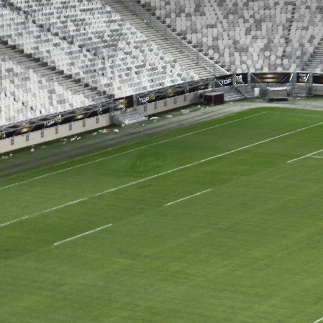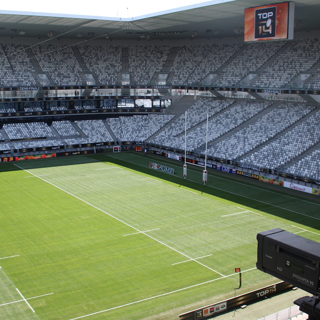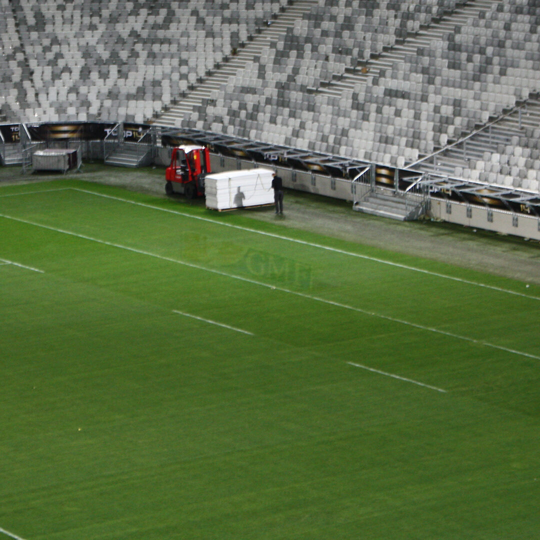 Nous avons habillé le terrain avec les trois logos propres au Top14 cette saison, en ajoutant Land Rover pour les phases finales, puis nous avons effacé ces quatre logos en fin de match avant la tonte et la réfection terrain.