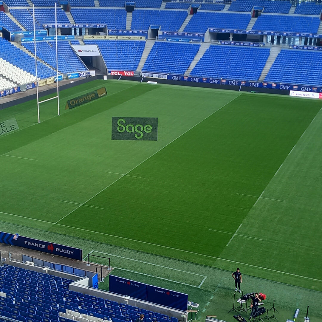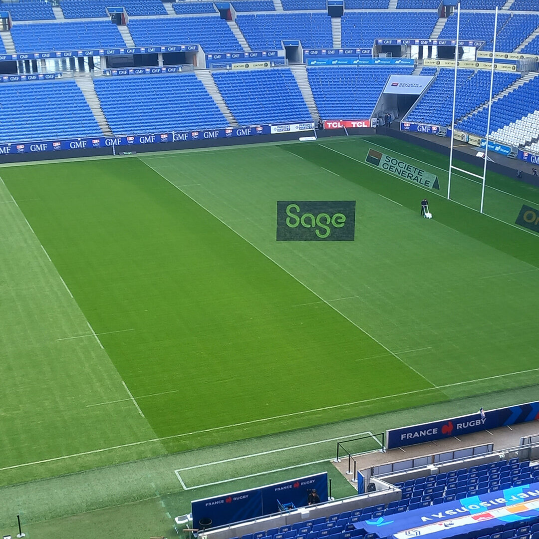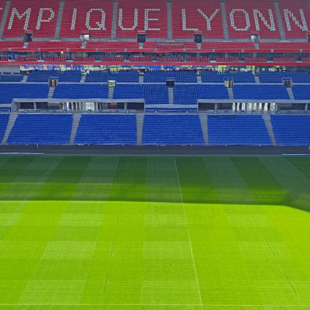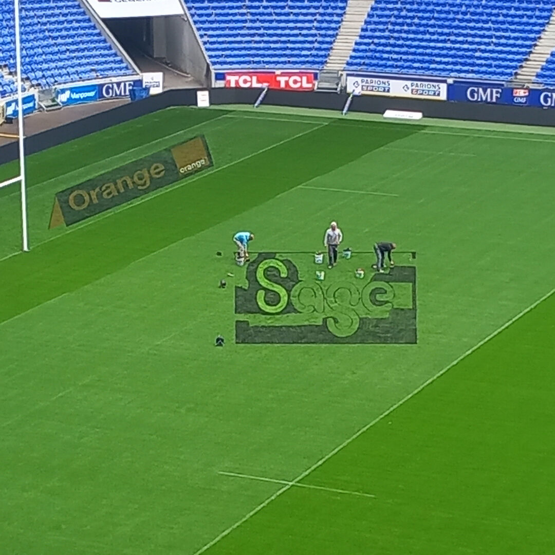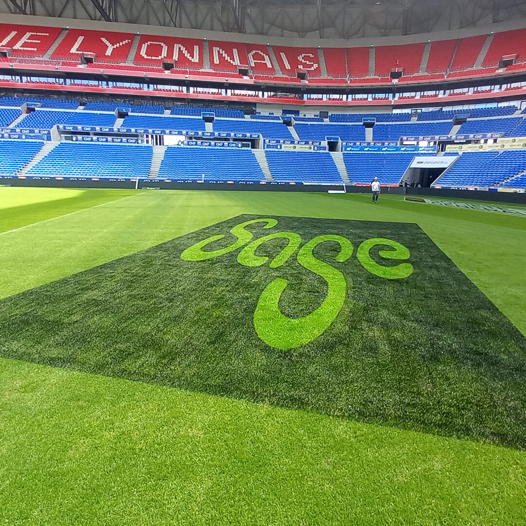 Nous avons réalisé 7 logos sur la pelouse du Groupama Stadium à Lyon-Décines, puis effacement.