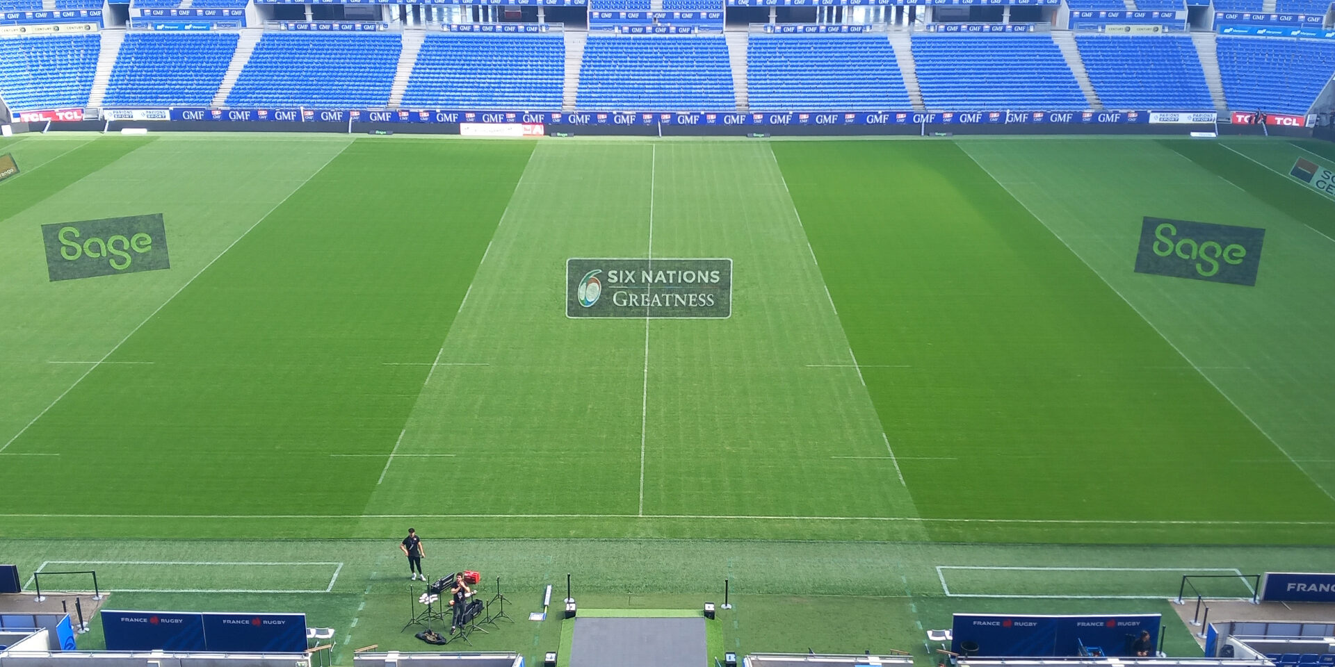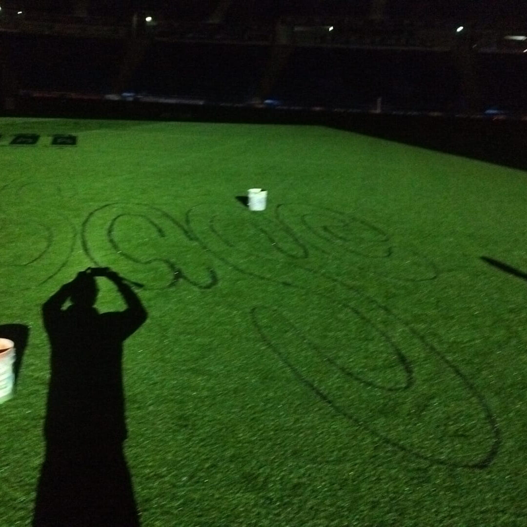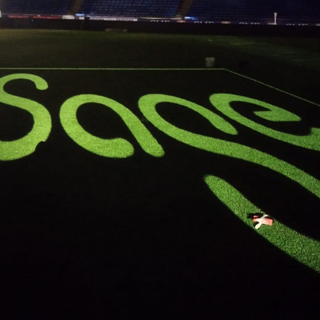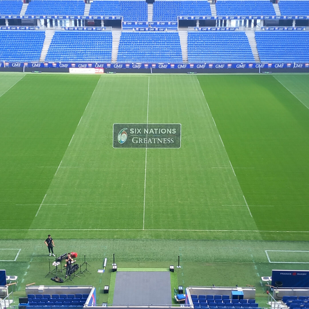 Nous avons réalisé 7 logos sur la pelouse du Groupama Stadium à Lyon-Décines, puis effacement.