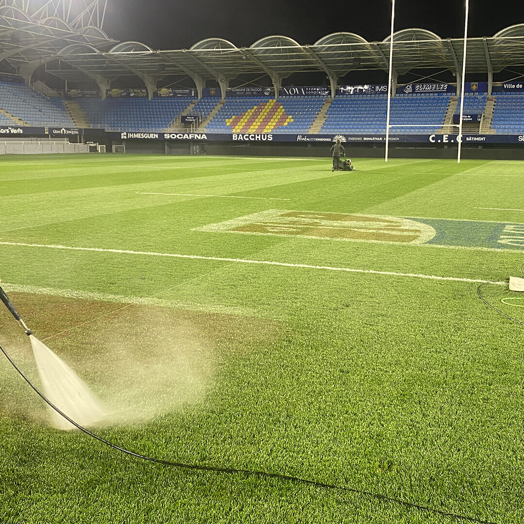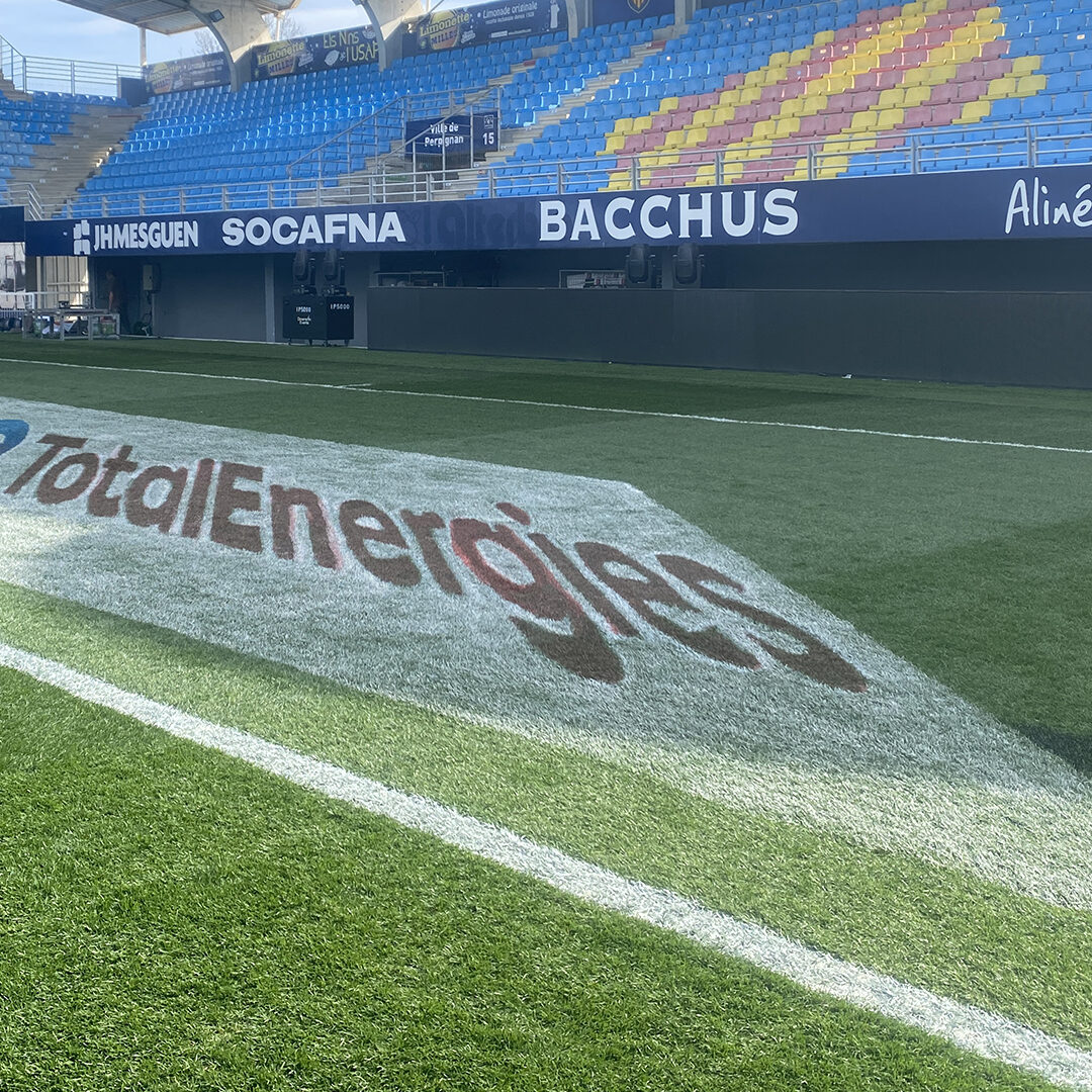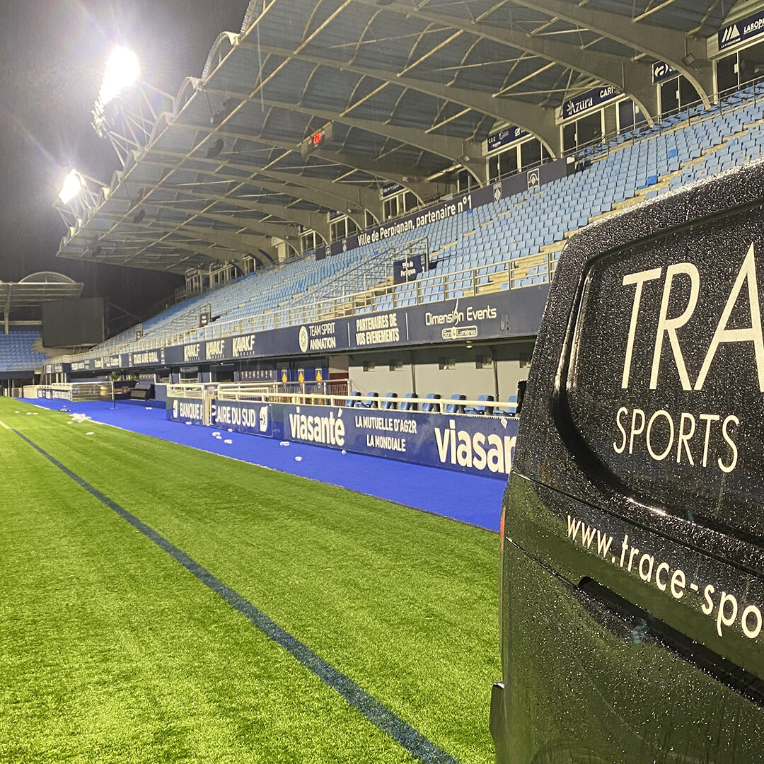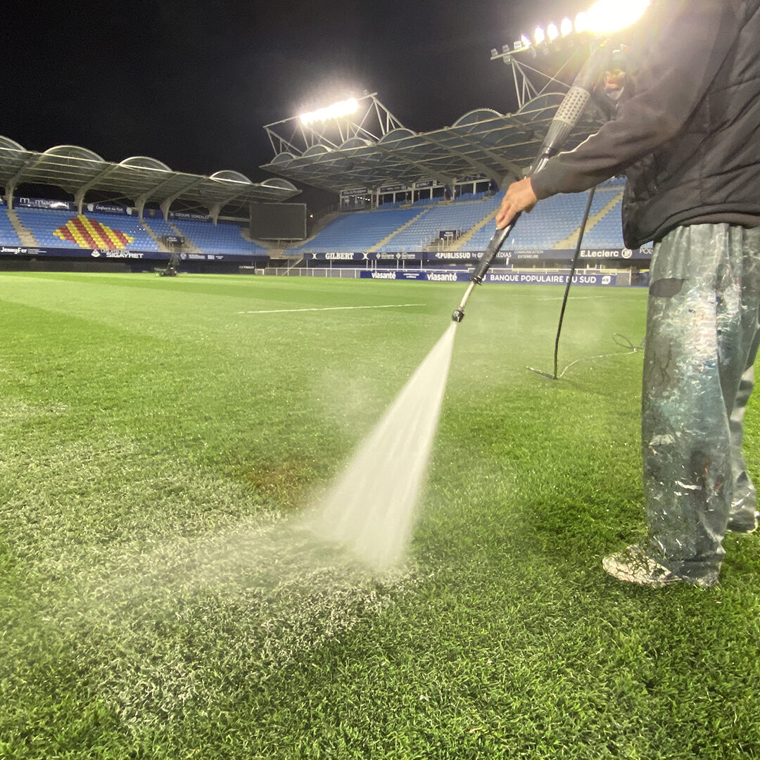 Préalablement, l’équipe Trace Sports a réalisé les 4 logos habituels des partenaires du tournois sur le superbe gazon du stade Aime-Giral, avec une peinture maltée pour faciliter l’effacement, sans aucune difficulté grâce à la chaleureuse collaboration de l’équipe des jardiniers et de son stadium manager. Belle collaboration qui s’est étendue après le match pour un effacement des logos sans accroc afin de révéler à la pelouse du stade son éclat naturel.
