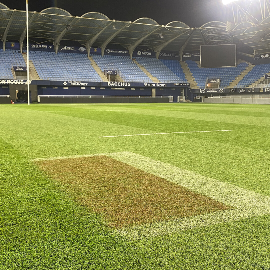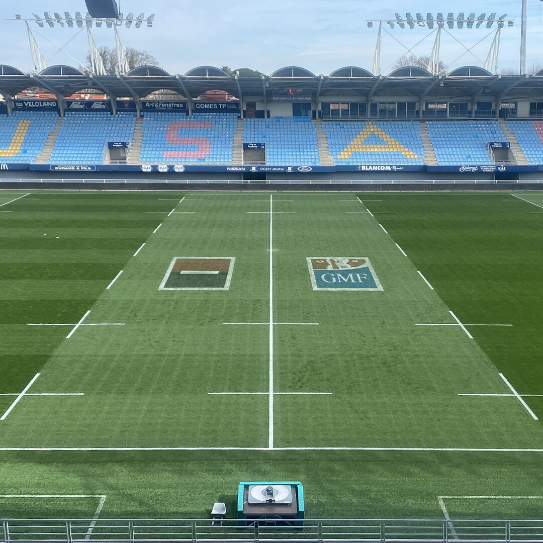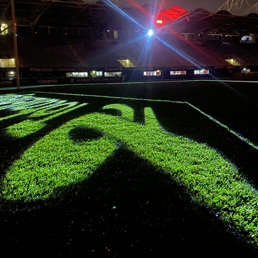 Préalablement, l’équipe Trace Sports a réalisé les 4 logos habituels des partenaires du tournois sur le superbe gazon du stade Aime-Giral, avec une peinture maltée pour faciliter l’effacement, sans aucune difficulté grâce à la chaleureuse collaboration de l’équipe des jardiniers et de son stadium manager. Belle collaboration qui s’est étendue après le match pour un effacement des logos sans accroc afin de révéler à la pelouse du stade son éclat naturel.