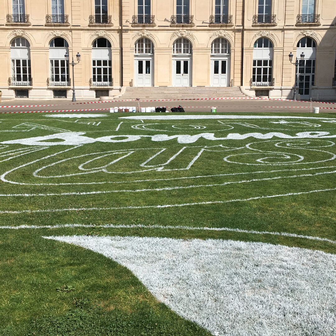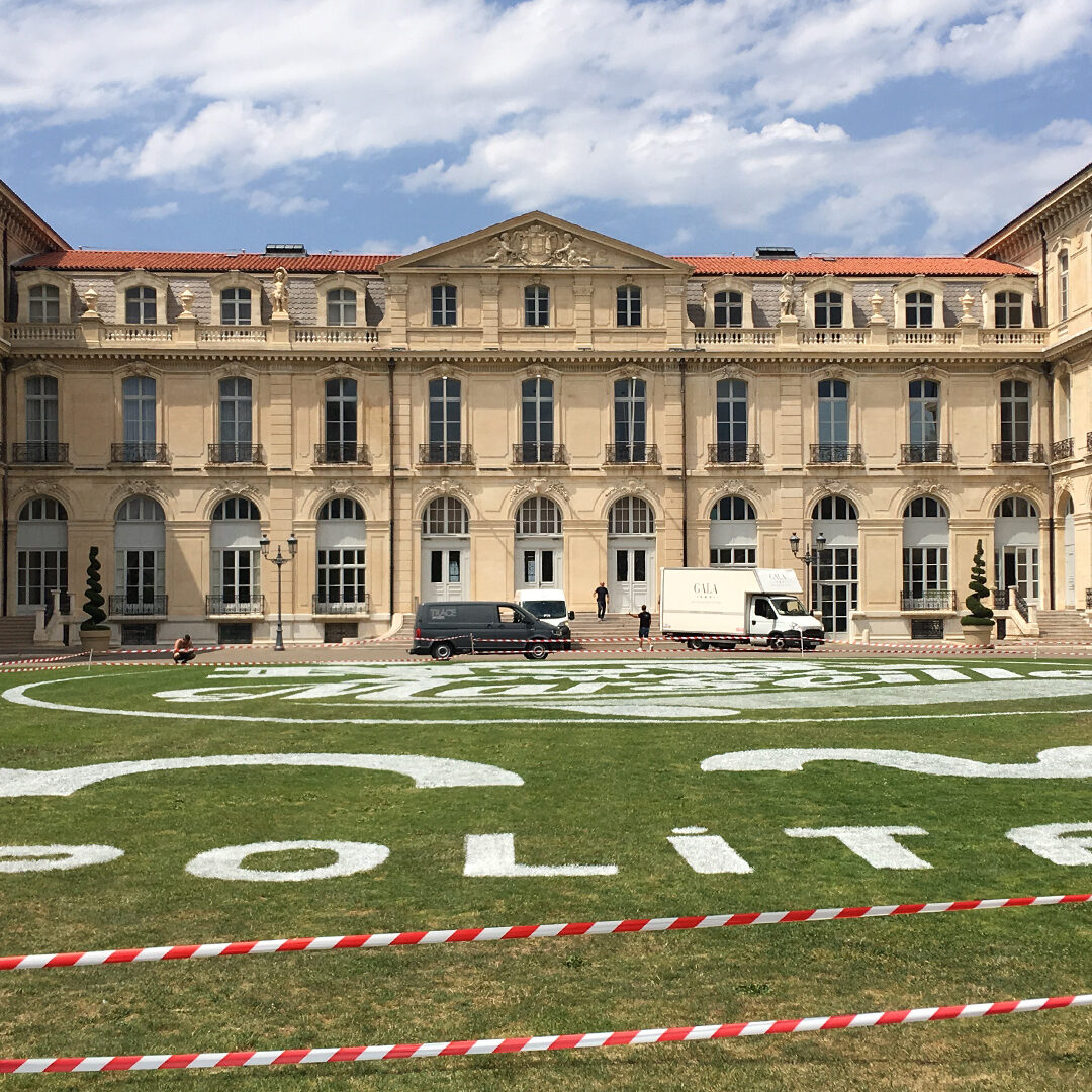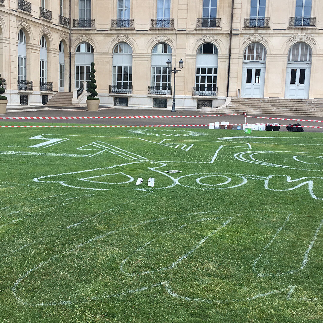 Nous avons habillé la pelouse du Palais du Pharo, magnifique momument marseillais surplombant le Vieux Port. La réalisation de ce marquage a nécessité pas moins de 120 litres de peinture répartis sur les 1000 m² de surface totale. Pour une plus grande précision le tracé a été suivi par GPS, 4 techniciens et un robot ont œuvré pendant 8h pour la réalisation de cette opération.