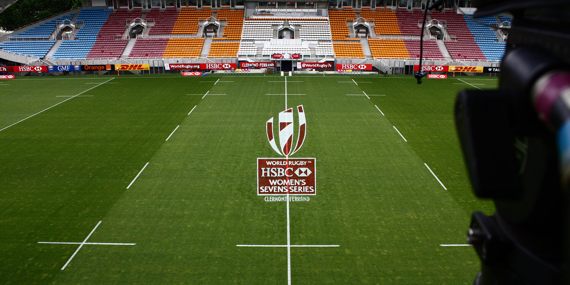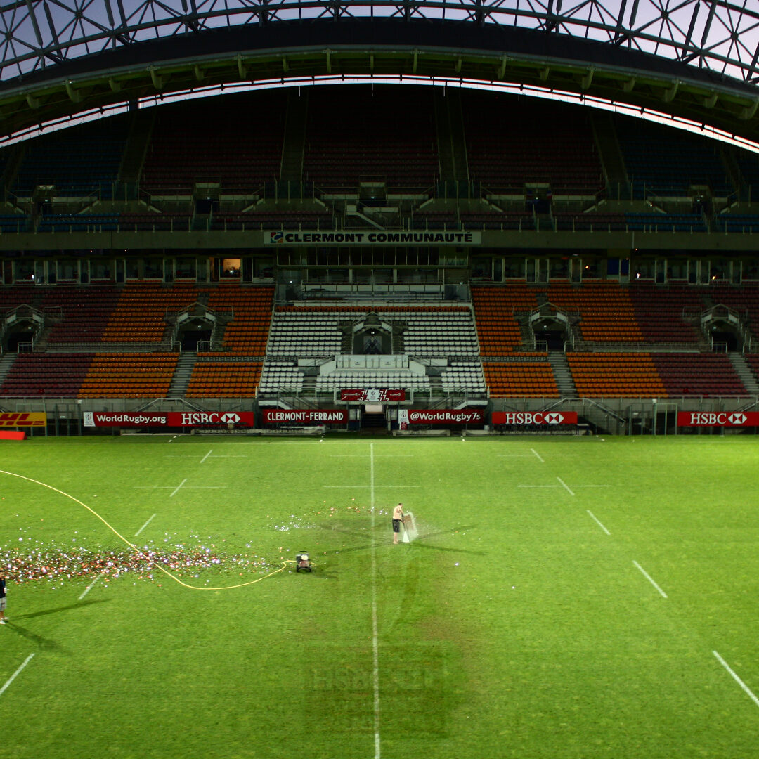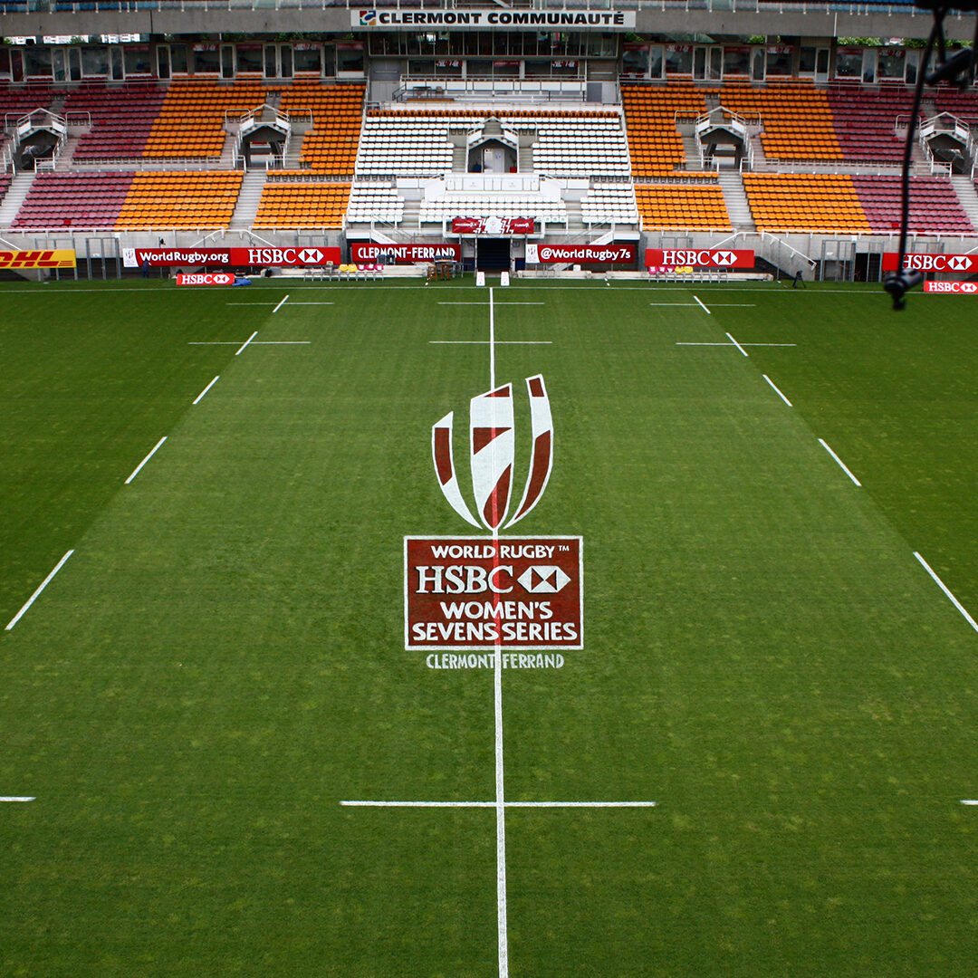 Le circuit mondial de rugby à 7 féminin faisait son ultime étape de la saison au Stade Gabriel-Montpied de Clermont-Ferrand ce week-end du 24 et 25 juin 2017. Nous avons réalisé le logo en centre du terrain, paré d’un rouge vif, habillé de courbes et de lettres peintes à la main. Après le bal, nous avons passé le gazon à la douche, conférant le caractère éphémère d’un évènement exceptionnel.